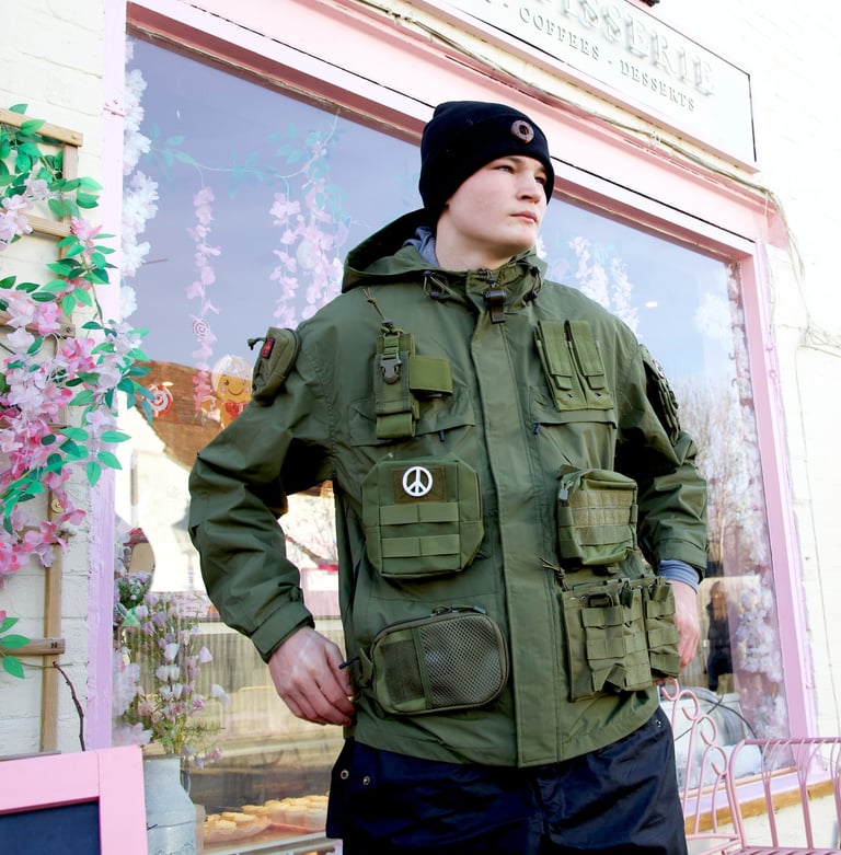 Medic crosses, peace symbols, and rescue-inspired detailing add a powerful contrast to the tactical backbone of the piece — a reminder that utility can serve more than conflict. The jacket blends heavy-duty military architecture with humanitarian iconography, creating a dual identity: tough yet empathic, rugged yet conscious, a piece designed for protection rather than aggression.