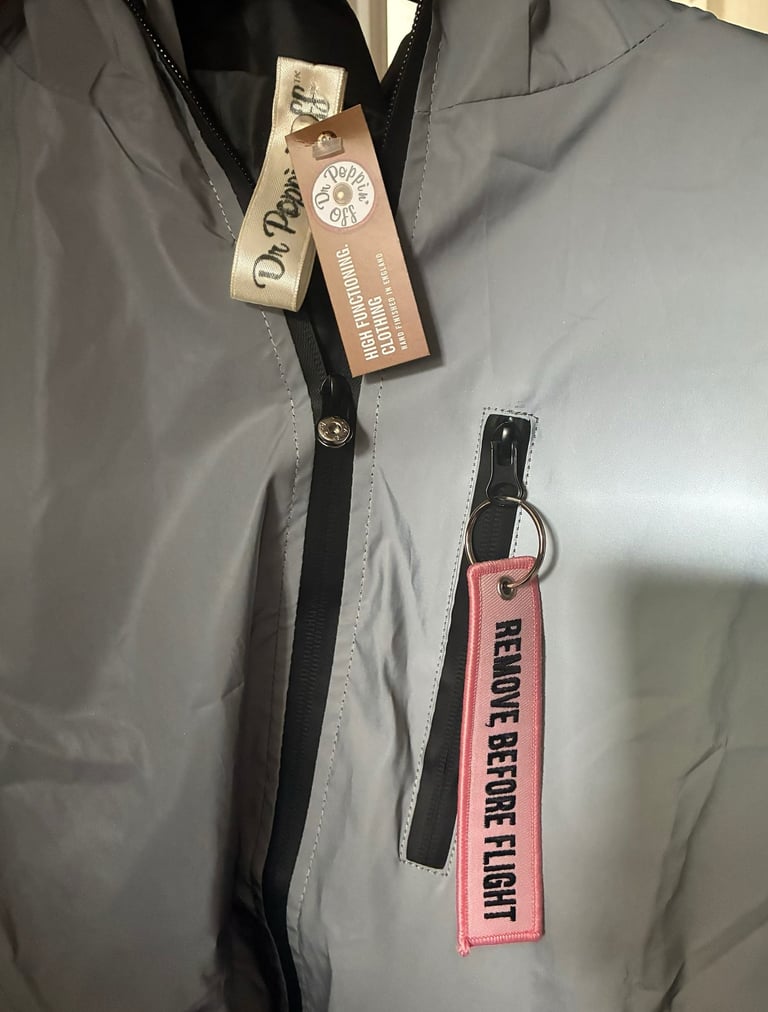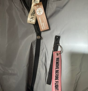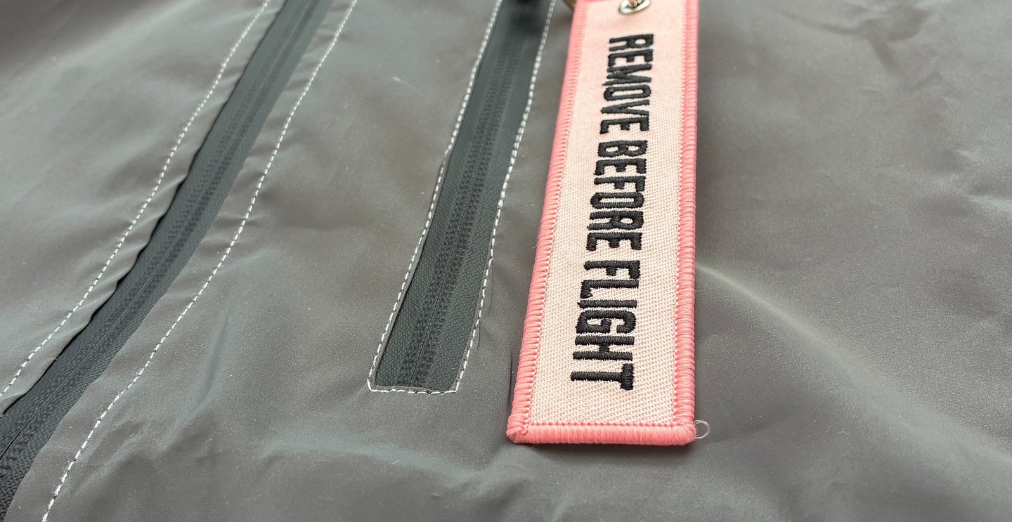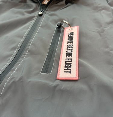 Welded zipper chest pocket emblazoned with our 'Remove Before Flight' Tag.